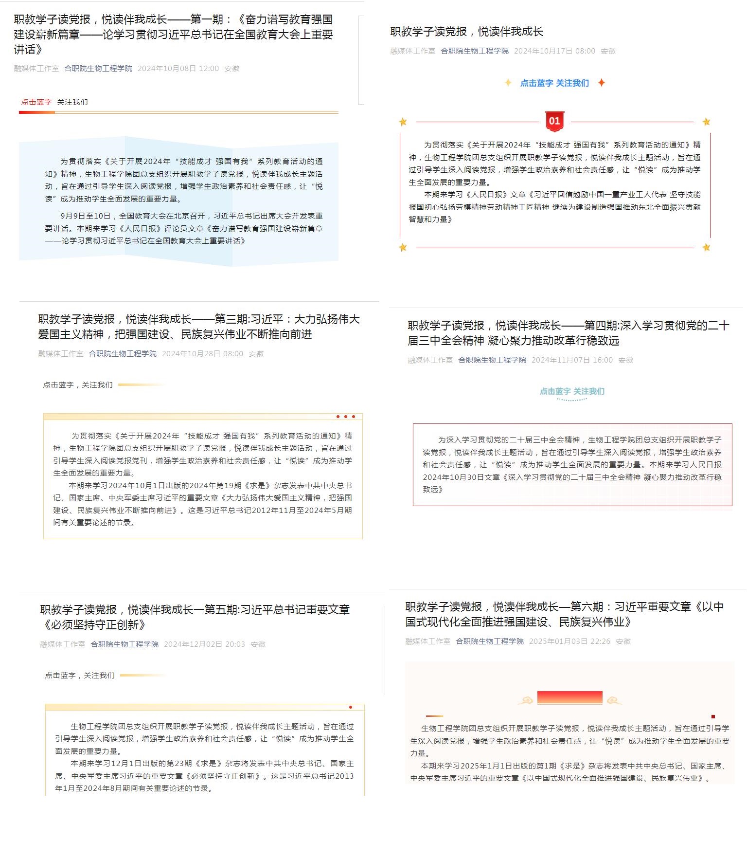 为全面贯彻党的二十大和二十届二中、三中全会精神,深入学习贯彻习近平总书记关于职业教育的重要指示批示精神,落实立德树人根本任务,加强职业学校学生思想政治教育,培养德技并修的高素质技能人才,自2024年10月以来,91精品一区依托官方微信公众号平台在全院范围内组织开展了“职教学子读党报,悦读伴我成长”活动。平台已推送6期《人民日报》、《求是》有关篇目原文,引导学生深入学习党的理论,了解国家大事,坚定理想信念,为培养担当民族复兴大任的时代新人注入新的活力。