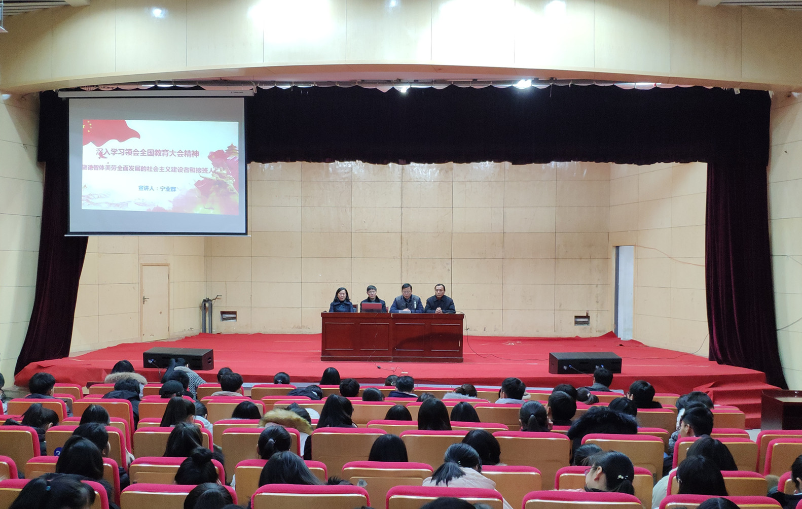 12月10-13日,根据学校要求,院党总支书记宁业群在大学生活动中心开展了三场《深入学习领会全国教育大会精神》的宣讲,寄语我院的在校生,乘着新时代的浩荡东风,放飞青春梦想,担当强国使命,努力成长为中国特色社会主义的合格建设者和可靠接班人。学校办公室主任王海、图书馆馆长夏菊华、91精品一区院长裴正峰组成的学校宣讲组莅临指导,宣讲会由王海主持。我院2017级、2018级在校生1200多人及相关专兼职辅导员聆听了全国教育大会精神。