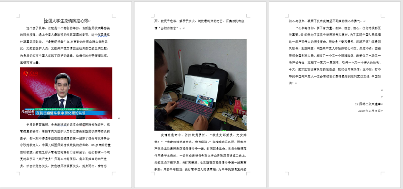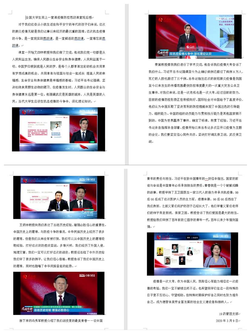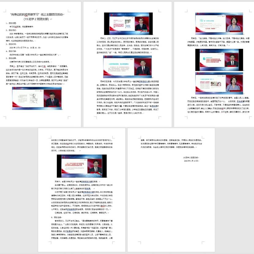活动开启之时,各班团支部对于如何学习“思政大课”采取了不同方式,如:师生在班级群中互动交流对于收看本课的感想;选出学生代表发表观后感言;鼓励学生以寝室为单位互相学习并交流想法;收集全班每一位学生收看大课时的现场照片及其观后感;动员全体学生每人分享一则自己身边亲眼所见亲耳所闻的抗疫小故事等等。