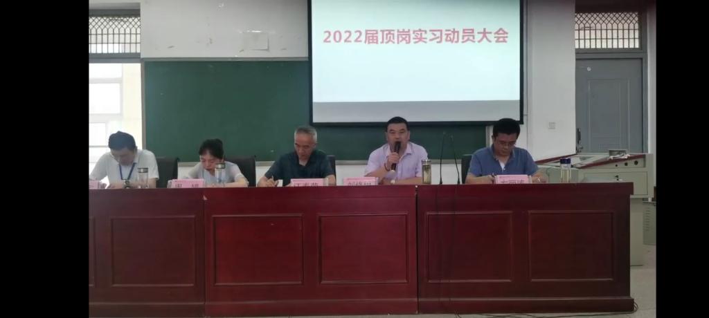 2021年6月15日下午5:30,我院在生化楼A305召开2022届顶岗实习动员大会。为避免疫情期间聚集,此次会议采用线上线下结合的方式进行。会议由学院院长刘修树主持,到现场参会的有学院书记汪春荣、副书记周婷、副院长方丽波、王文宇和各实习点组长,其他未到现场的2022届顶岗实习生通过钉钉线上观看。