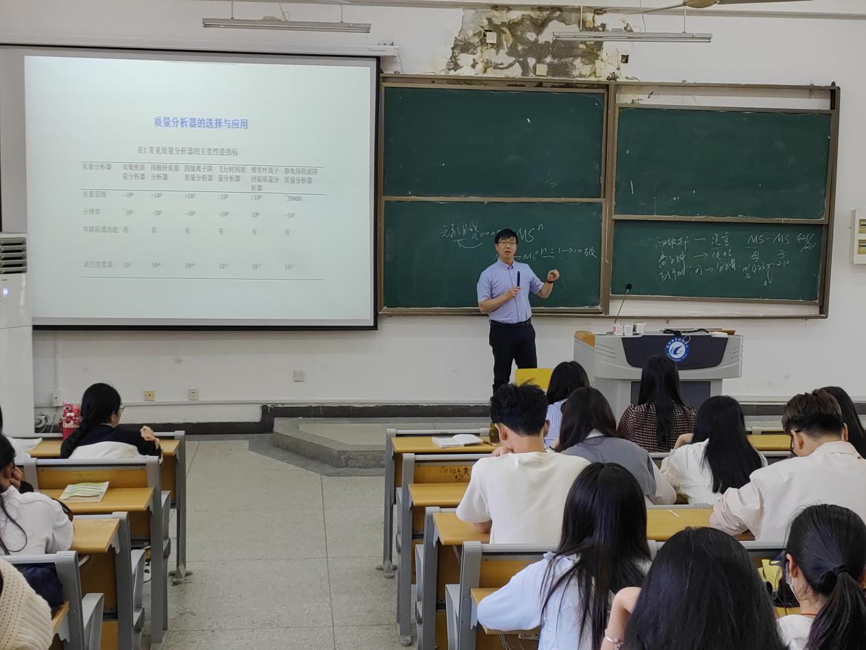 首先汪电雷教授从质谱结构引入,重点讲解质谱技术在分析多领域的应用及发展。一是在生活中应用,以合肥市生活污水中违禁药物的监测为切入点,通过质谱四极杆的联合应用,降低监测噪音,提高分析的灵敏度,使超低浓度物质检测成为可能。二是以自身课题研究内容为例,聚焦质谱技术在中药研究的应用。提示质谱分析技术不仅应用于科学实验室,还可以生活中应用,为国家在违禁药物监测方面提供科学手段,从而激发了学生对分析技术前沿知识兴趣和热爱。