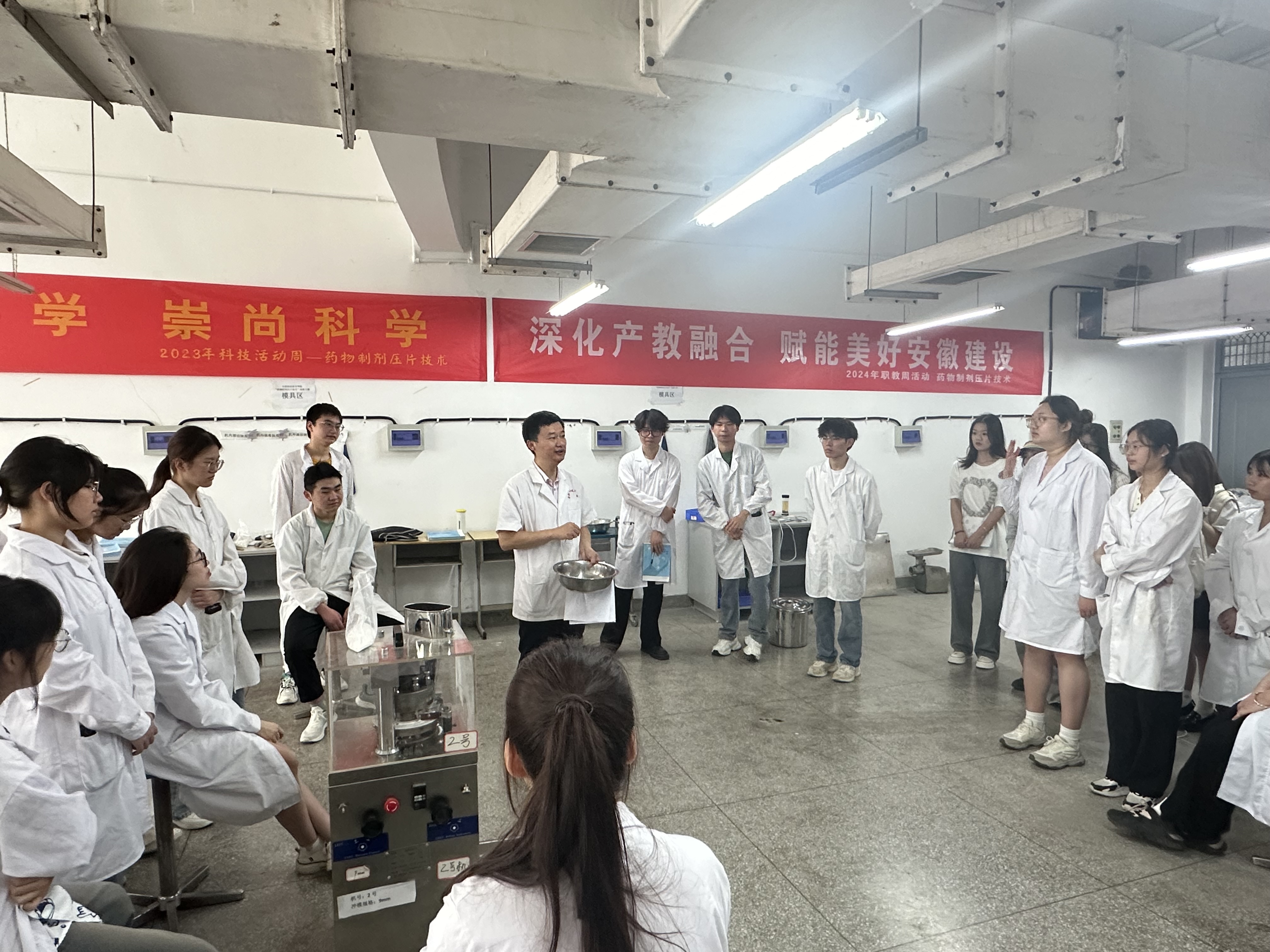 为贯彻落实“深化产教融合,赋能美好安徽建设”职教周主题精神,5月22日在鼓山校区药物制剂实训中心开展“药物制剂压片技术”科普体验活动。本次活动集中展示现代制药技术和制药设备,涉及模拟药品生产企业的片剂岗位、胶囊制备岗位和包衣岗位及其关键设备旋转压片机、全自动胶囊填充机及片剂高效包衣机等实操内容。91精品一区第一党支部范高福工作室“双带头人”范高福、韦梦强两位老师担任讲解员,接待校内园林类专业、食品类专业及其他专业参观人员80余人次。