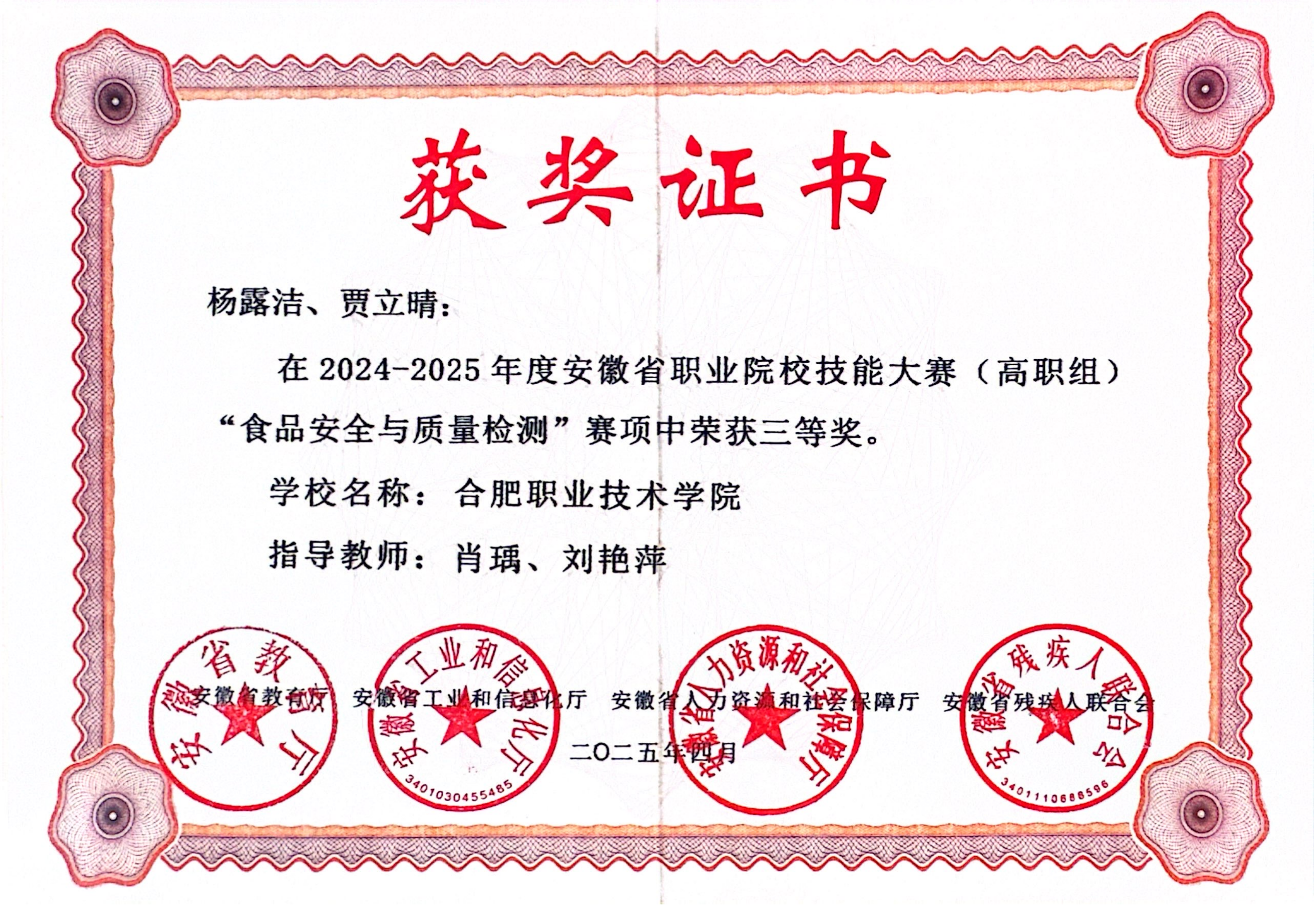 近年来,教学成果丰硕。在2024年安徽省食品设计创新大赛中,获得三等奖1项;在安徽省“互联网+”大学生创新创业大赛中,分别在2021、2022、2023铜奖各1项,2020获铜奖2项;2023年第十一届“挑战杯 华安证券”安徽省大学生创业计划竞赛获铜奖1项;在2024-2025年度安徽省职业院校技能大赛(高职组)“食品安全与质量检测”赛项中获得三等奖2项。