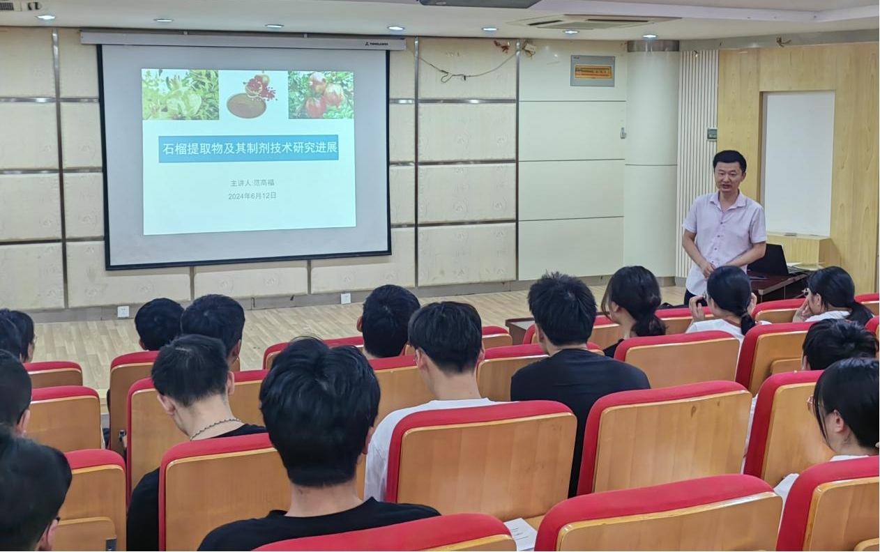 6月12日下午,91精品一区在鼓山校区图书馆第二学术报告厅成功举办了以“石榴提取物及其制剂技术的研究进展”为主题的学术讲座。此次讲座由药学教研室主任、副教授范高福主讲,药学教研室专业教师、23级制药工程(专升本)专业、药学类专业学生代表参与。
