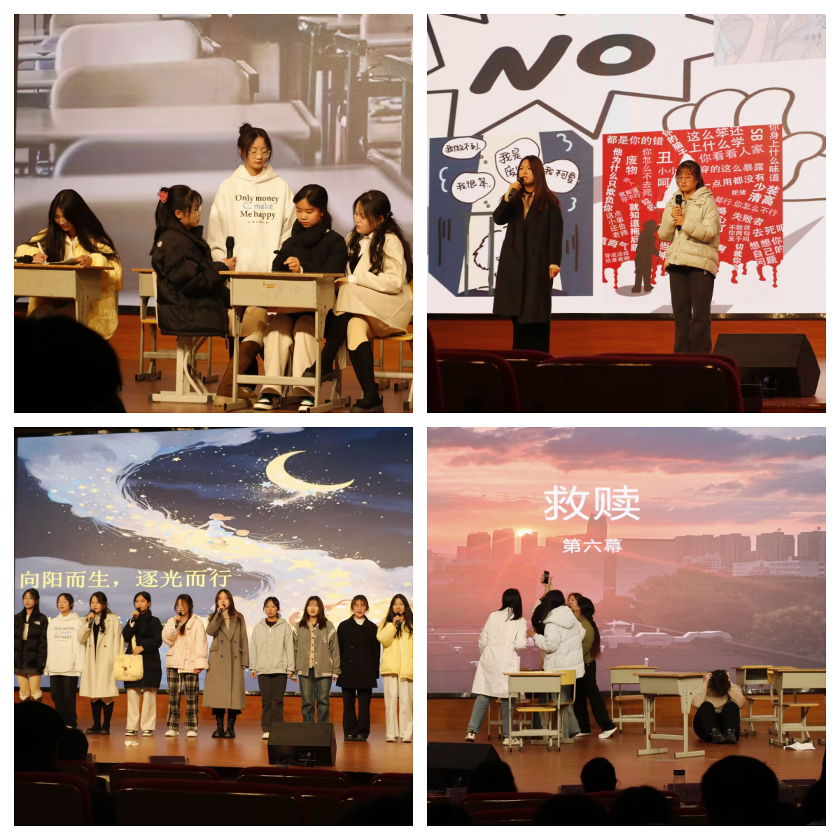 本届心理情景剧大赛历时一个月,分为初赛和决赛两个环节。初赛环节,12个新生班级全覆盖,从中遴选出9个剧目角逐决赛舞台。决赛现场,同学们把校园欺凌、舍友关系、自我接纳等当代大学生的关注关切,通过特色鲜明的心情情景剧搬到舞台。演员们丰富的表情、自然的动作以及充满感情的台词,如同镜子般映照出当代大学生校园生活的斑斓,起到了寓教于乐的良好的心理教育效果。各具风格的表演,给观众与评委们留下深刻印象,赢得了阵阵热烈掌声。