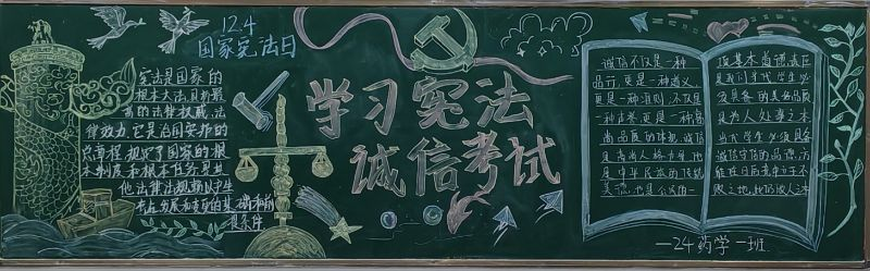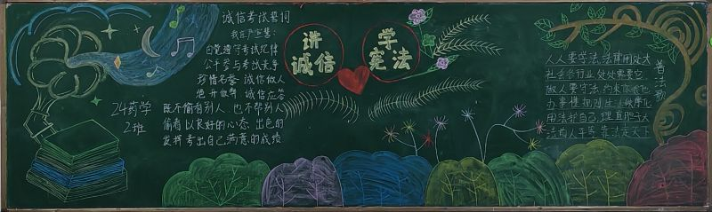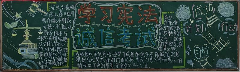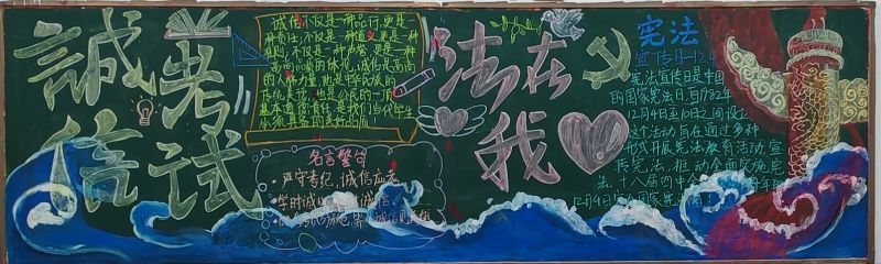 各班围绕“弘扬宪法精神,专注诚信考试”的主题,深入挖掘宪法内涵,结合校园生活与社会热点,精心构思、设计并绘制了内容丰富、形式多样的黑板报。他们以宪法为启蒙之光,点亮智慧明灯,引领同学们在宪法知识的海洋中遨游,不断汲取法治精神的养分。同时,他们通过生动的漫画形象以及创意标语等形式,将诚信考试的内容巧妙融入其中,使黑板报既具有教育意义,又富有吸引力,激发了同学们学习宪法的热情与诚信考试的自觉。