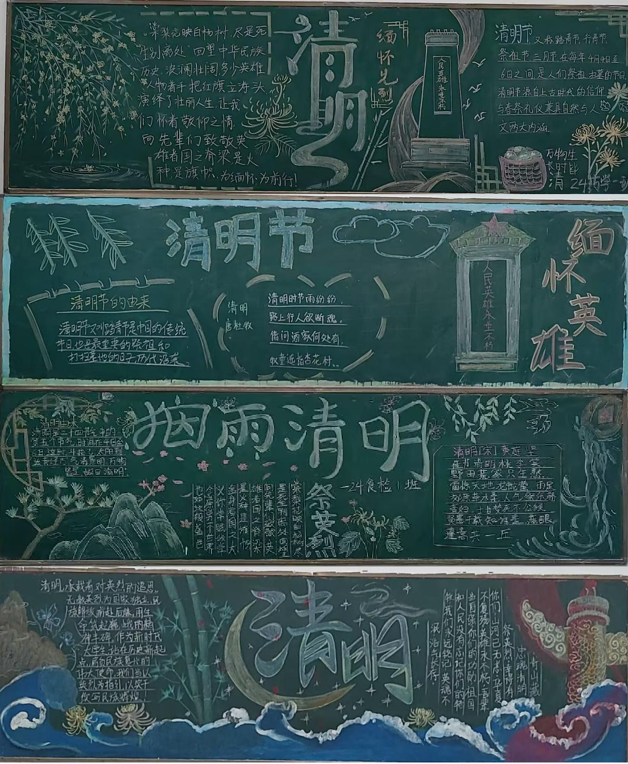 同学们积极准备、精心设计,及时、认真完成了黑板报。同学们通过搜集革命先辈的英雄事迹和清明节的历史起源、节日习俗等方面的知识,设计出一幅幅内容丰富、创意新颖、布局合理的黑板报,图文并茂、赏心悦目。各班级以自己独有的风格表达了对党的热爱,对革命先烈的缅怀,对中华优秀传统文化的认同。