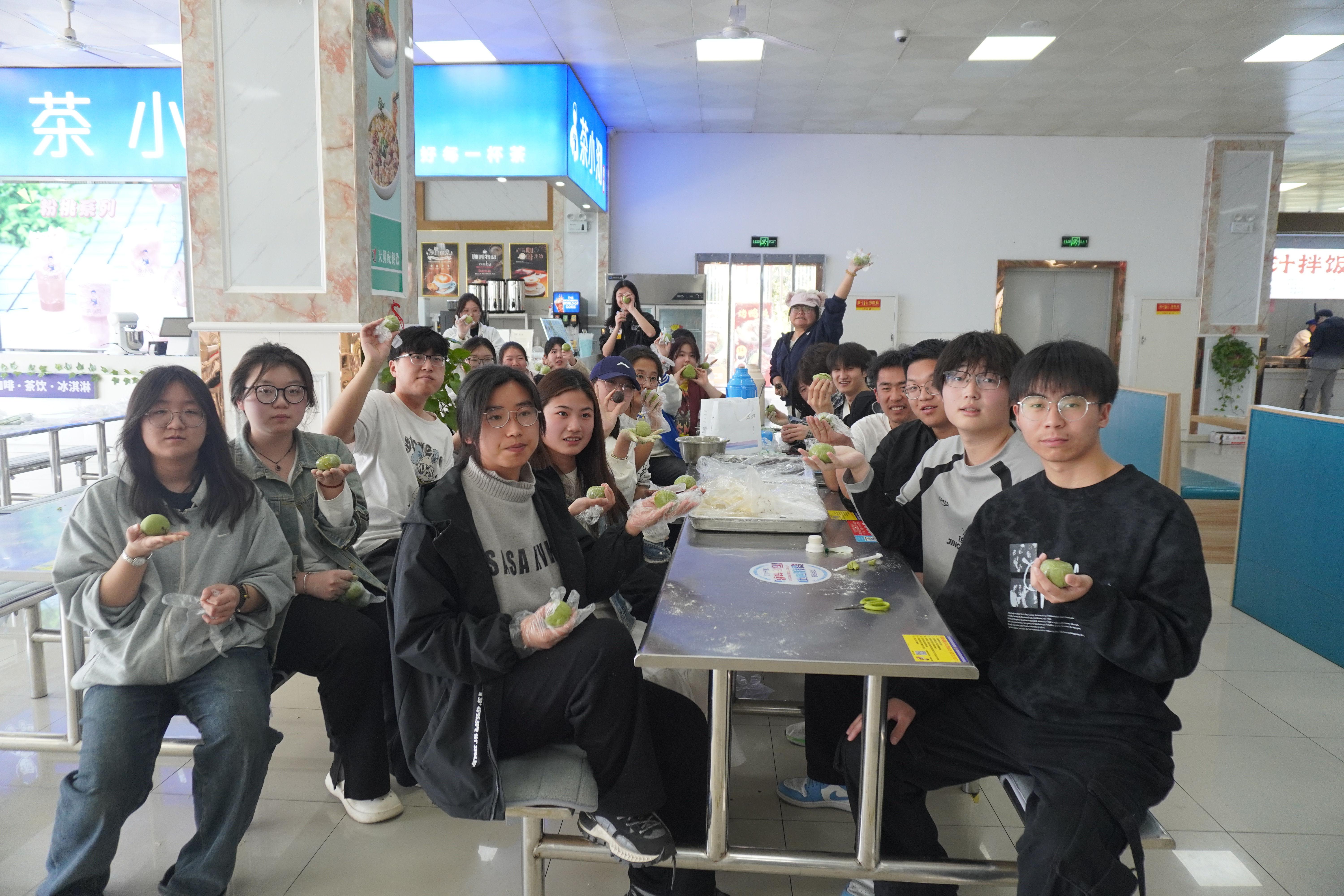 活动现场,食堂里热闹非凡,桌上摆放着糯米粉、豆沙馅等食材。在老师和几位擅长传统美食制作的同学示范下,大家纷纷动手。揉面团、包馅料、搓青团,搓成一个个圆润可爱的青团,包入馅料,然后轻轻捏合封口,搓成圆润的青团。在大家的共同努力下,一个个碧绿如玉、圆润饱满的青团逐渐摆满了托盘。现场,不仅制作了豆沙、蛋黄肉松等经典口味,还创新推出坚果等新式青团。尽管大家手法起初略显生疏,但在互相交流与帮助下,逐渐熟练起来,老师们与同学们亲切互动,现场欢声笑语不断,大家互相品尝作品,分享制作心得。最后,同学们将自己制作的青团精心包装好,并将一部分青团赠送给食堂辛勤工作的叔叔阿姨,传递忙碌生活的一份小美好。活动中还穿插了青团文化讲解环节,汪纬静老师介绍了清明节习俗与青团的象征意义,进一步加深了同学们对传统文化的理解。