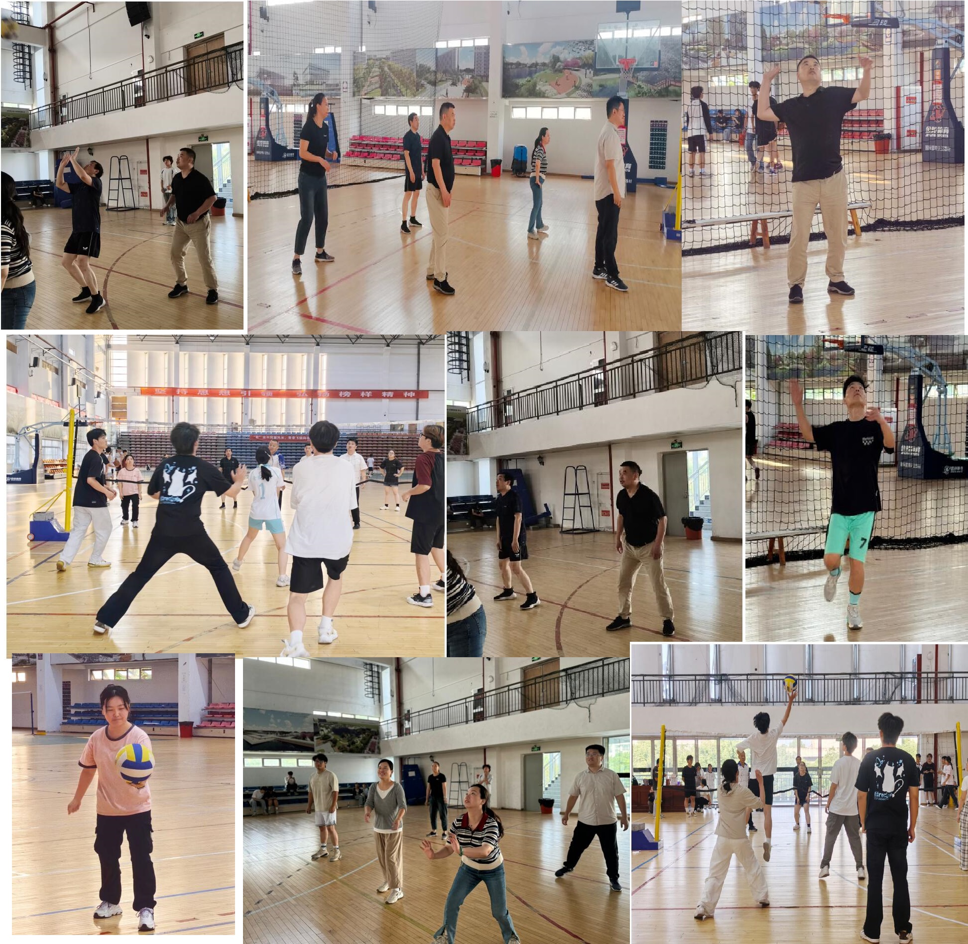 为保证比赛的高水准与公平性,学院精心组建了教师精英队与学生精英队,其中学生队由24级各专业选拔优秀选手组成。随着一声清脆的哨响,比赛正式拉开帷幕。场上队员们精神抖擞,迅速进入状态。发球环节,选手们或稳健抛球大力扣发,或巧妙运用手腕力量打出旋转球,让对手防不胜防;接球时,大家迅速移动脚步,默契配合,飞身鱼跃救球、精准垫球、有力传球的精彩瞬间接连不断。进攻端,队员们灵活跑位,瞅准时机高高跃起,一记记势大力沉的扣杀,引得场边观众阵阵欢呼;防守时,严密的拦网、快速的补位,展现出强大的团队协作能力。赛场上,平日里严谨认真的教职工们化身活力四射的运动员,尽情挥洒汗水,他们时而为打出精彩配合击掌相庆,时而为出现失误互相鼓励。每一次攻防转换都充满悬念,每一分的争夺都扣人心弦。场边的拉拉队也不甘示弱,加油声、呐喊声此起彼伏,为比赛增添了热烈的氛围。