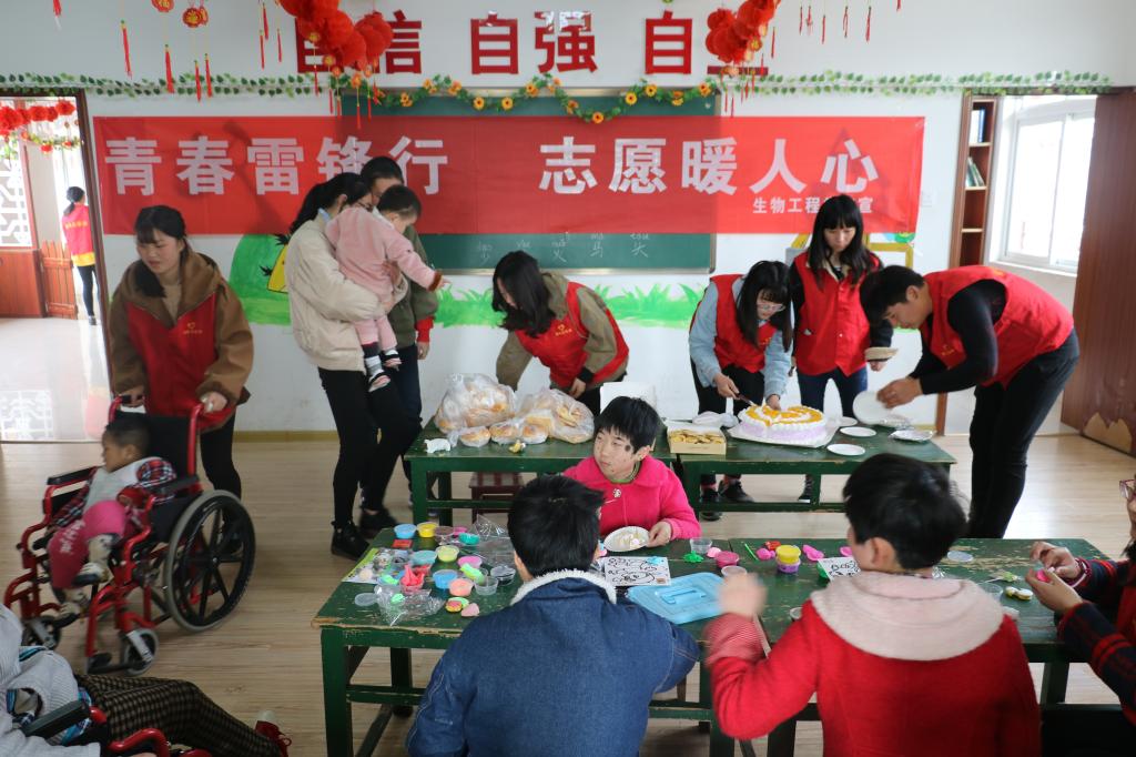 福利院的孩子多是因残疾或疾病被家人所遗弃,既有尚需抱在怀中的幼儿,也有三十多岁仍然无从走向社会的成人。他们热情、开朗,积极参与互动;他们懂得体贴、关心他人。虽然大多数孩子身体机能受损,智力有缺陷,但是脸上洋溢的笑容感染了每一位志愿者。一名女生默默摘掉手上陪伴自己多年的红绳,将它系到帮扶孩子的手腕上。这是一份心意的传达,更是一份祝福的寄托。