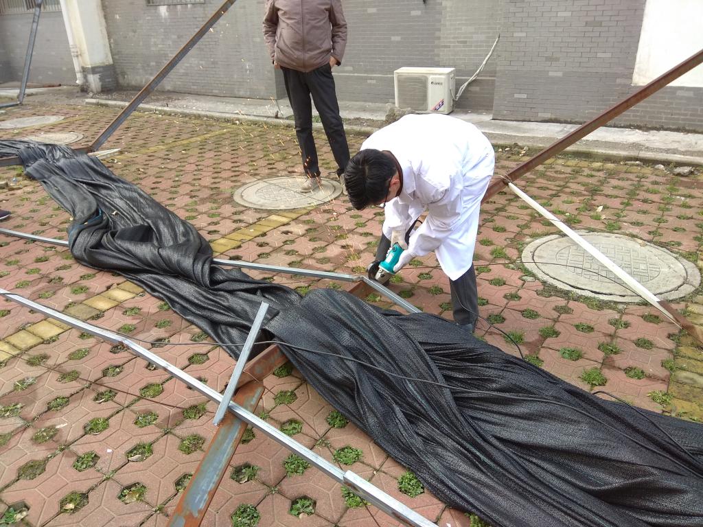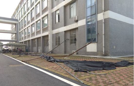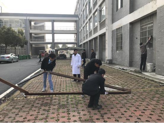 2018年冬季的几场暴雪压垮了生化楼前的车棚,导致棚顶压塌,棚架出现歪斜,既存在安全隐患,又严重影响校园观瞻,亟待撤除。为彻底消除安全隐患,保障出行安全,营造文明美观的校园环境,我院组织教职工及学生志愿者开展清理活动。由于年久失修,车棚铁架腐蚀严重,不少已折断挂在空中,难以切割。我院领导特借来专业工具亲自上阵,带领大家全程徒手拆除。在志愿者的配合下,不到半小时,隐患车棚全部拆除。