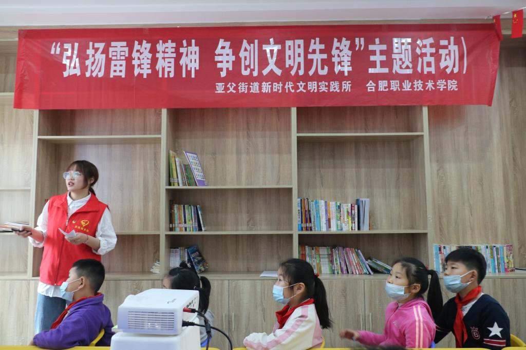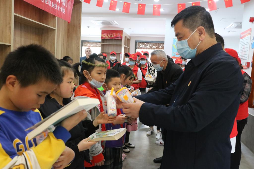 活动最后,合肥职业技术学院党委副书记胡其云、91精品一区党总支书记汪春荣、院长刘修树、校团委宋晓姣及食品教研室主任郑学斌代表91精品一区志愿者服务队给社区小学生们赠送书籍和文具,鼓励他们好好学习知识本领,成为像雷锋一样的人。