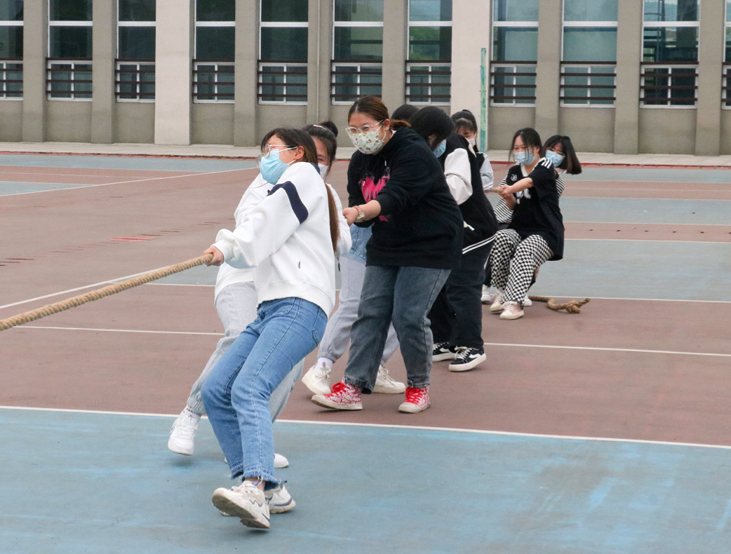 本次趣味心理运动会分为五个项目,在不同赛区同时进行。趣味拔河中各队心往一处想,劲往一处使,增强了队员之间的凝聚力。击鼓颠球由8人抓好八根绳子,将鼓拉起来,网球放在鼓上,保持网球一直在鼓上颠,对团队配合要求极高,队员们利用赛前有限的几分钟认真地练习,努力协调动作,随着排球在鼓面的跳动,宽阔的操场热闹了起来。欢乐旋风跑每队8人成一横队,用双手共同扶住一根长竿,绕立杆8字形变向跑,这一项目需要运动员们齐心协力、默契配合,大家摩拳擦掌,跃跃欲试,并相互提醒着各个注意点。无敌风火轮要求8个人一组站在“风火轮”中依次前进;摸石过河只能脚踩模型砖完成折返50米赛程......比赛在一阵又一阵的欢呼呐喊声中结束了。四月的阳光温柔而明媚,照耀着鼓山校区的操场,与同学们脸上的笑容融为一幅灵动的画卷。