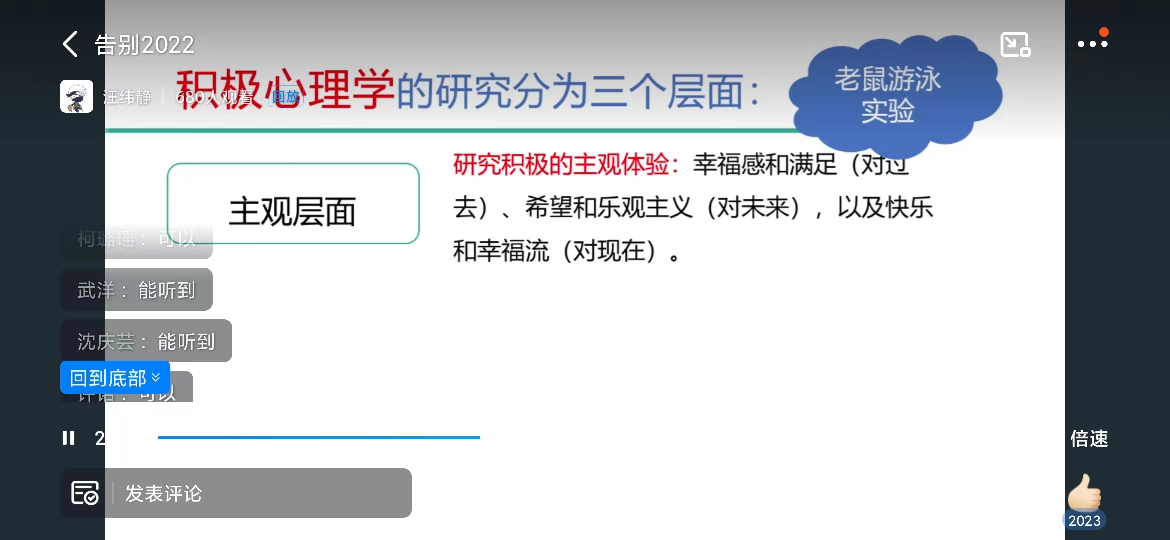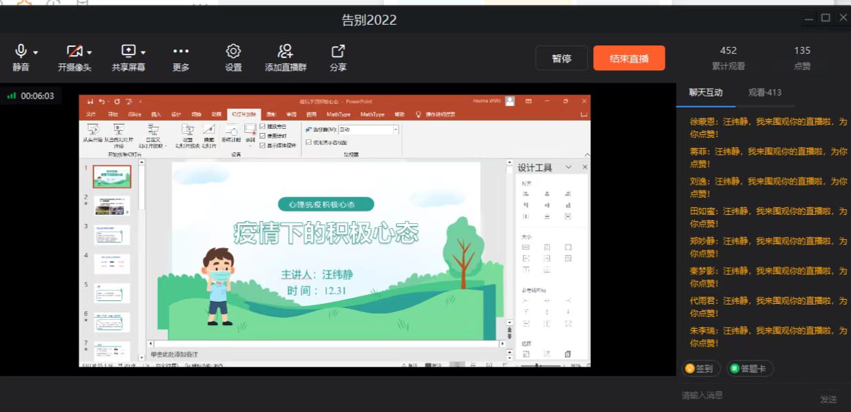 为扎实做好现阶段91精品一区学生的心理健康教育工作,引导广大学子及时调控不良情绪,以积极心态进行自我防护,增强其应对新挑战的心理免疫力,2022年12月31日下午,91精品一区心理老师汪老师展开了一场主题为“疫情下的积极心态”的线上讲座,此次讲座面向21级、22级全体学生。