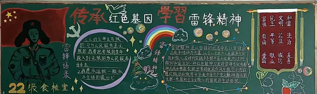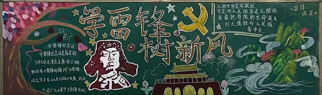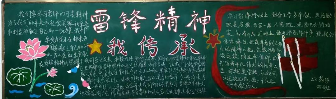 在91精品一区团总支的号召下,22级各班学子积极参与板报设计,他们通过各种信息渠道搜集、了解有关雷锋的助人事迹和奉献名言,小组讨论、头脑风暴将雷锋的故事提炼出来形成文字呈现在板报上,一笔一划,认真地书写着同学们对雷锋同志的敬仰之情。五星红旗、向日葵、荷花......奇思妙想的绘画部分是他们心中对中华民族传统美德的具象化表达,象征着同学们内心深处对雷锋这位共产主义战士的尊重和缅怀。字画相间融合,创造出了一幅幅丰富精彩的优秀板报。