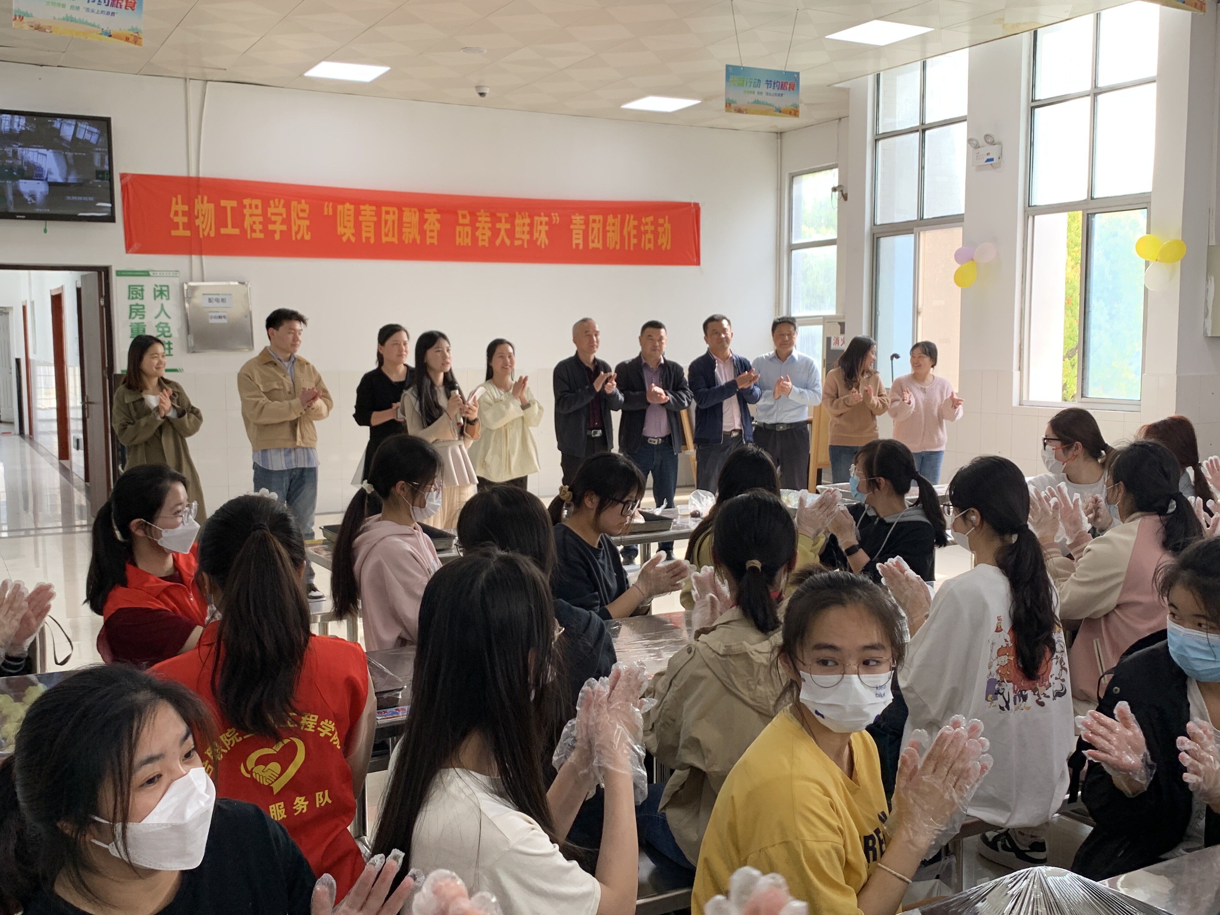 己喜欢的馅料进行制作。在一片欢声笑语中,师生共包青团,切身感受民俗文化的底蕴和制作青团的乐趣。一个个青绿的小团子被揉搓成形,同学们还不忘发挥自己的想象力,在青团的表皮上进行点缀,制作属于自己的独家记忆。等待青团蒸熟的过程中,社团部准备了一系列小游戏:抢板凳、猜歌名……还有新生十佳歌手大赛的选手们倾情献唱。在这融洽而温馨的氛围里,活动也渐渐进入尾声。