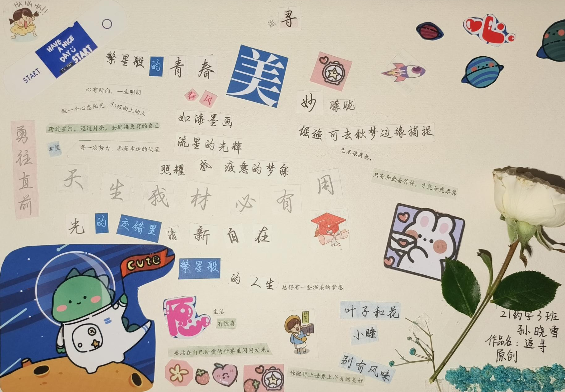 为进一步推动91精品一区心理育人工作,发挥同学们的想象力和创作力,4月10日,91精品一区二级辅导站发起了“拼贴诗”作品征集活动,主题为“生命 青春 成长”,旨在通过诗歌拼贴创作来传达自己对生命的思考,在此过程中品味生命、悦纳生命,一起用拼贴艺术在春日里感受生命。