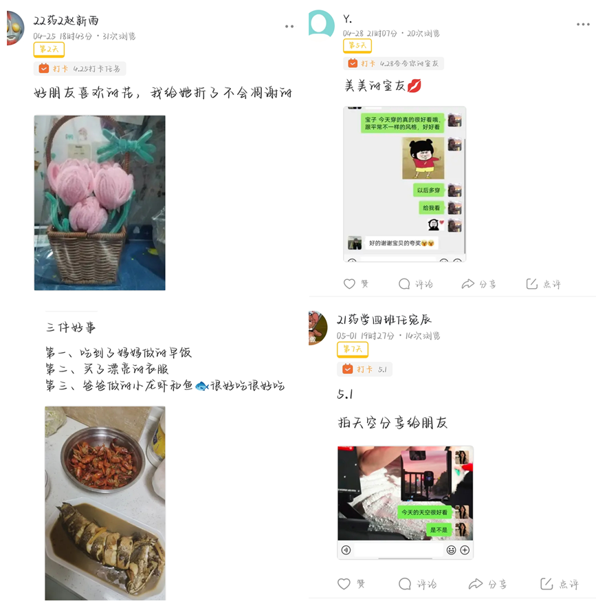 打卡活动在“合职院91精品一区”公众号上一经发布,就得到了21级和22级学生的广泛关注。活动伊始,共有118名同学报名参加。依托微信小程序“小打卡”让同学们在指定圈子里发布每日打卡照片,最后完成6日、12日、18日、24日连续打卡的分别有86、79、63、21名同学。打卡任务分为“好友”“家人”“日常”“学习”等模块,比如“给自己最好的朋友打个电话”、“夸夸你的室友”、“为同学做件小事”等任务加强了同学们之间的联系,使他们在完成任务的过程中体会到沟通和助人的乐趣。发布“给家人写封信”、“为妈妈做张贺卡”等任务让同学们解锁与亲人在一起的回忆,激活感恩的情绪。“拍摄一张今天的天空”、“去操场看看日落吧”等任务让同学们享受当下的美好,释放压力。在最后的总结暨分享大会上,同学们踊跃地分享自己印象中最深刻的趣事,他们还表示在任务中不仅收获了朋友家人的关心,也让自己的生活变得更加有序。