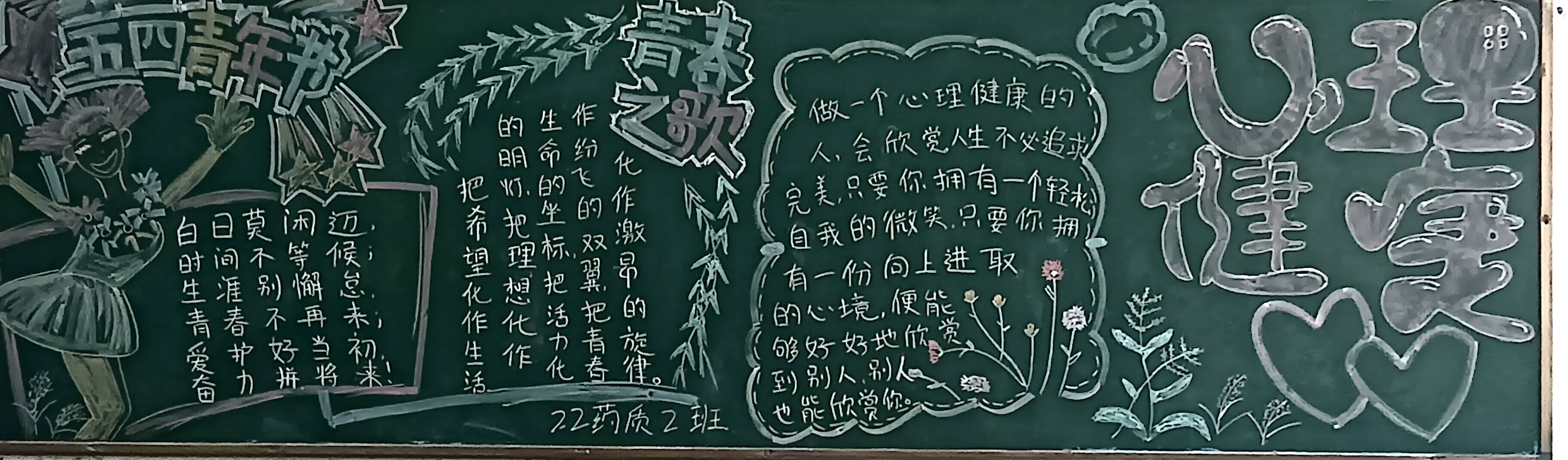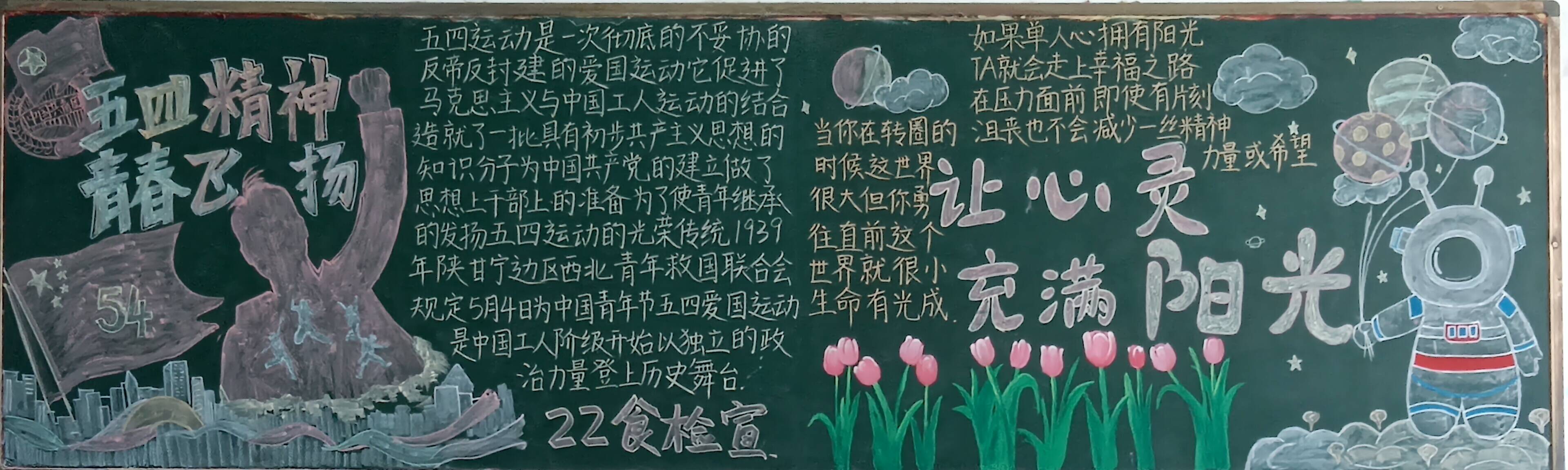 在学院的号召之下,同学们积极投入黑板报设计之中,将青年文化建设与五四青年节相结合,展现爱国情怀的同时,也用文字和图画表达出了自己对新时代的美好祝愿,一笔一划在黑板上勾勒出青春的光彩,时代的蓝图。用太阳代表蓬勃向上的态度,用鲜花代表美好自信的活力,用飘扬的红旗代表春的姿态,体现出当代青年人奋进坚韧,坚守初心的品质,传达爱国、进步、民主、科学的五四精神。