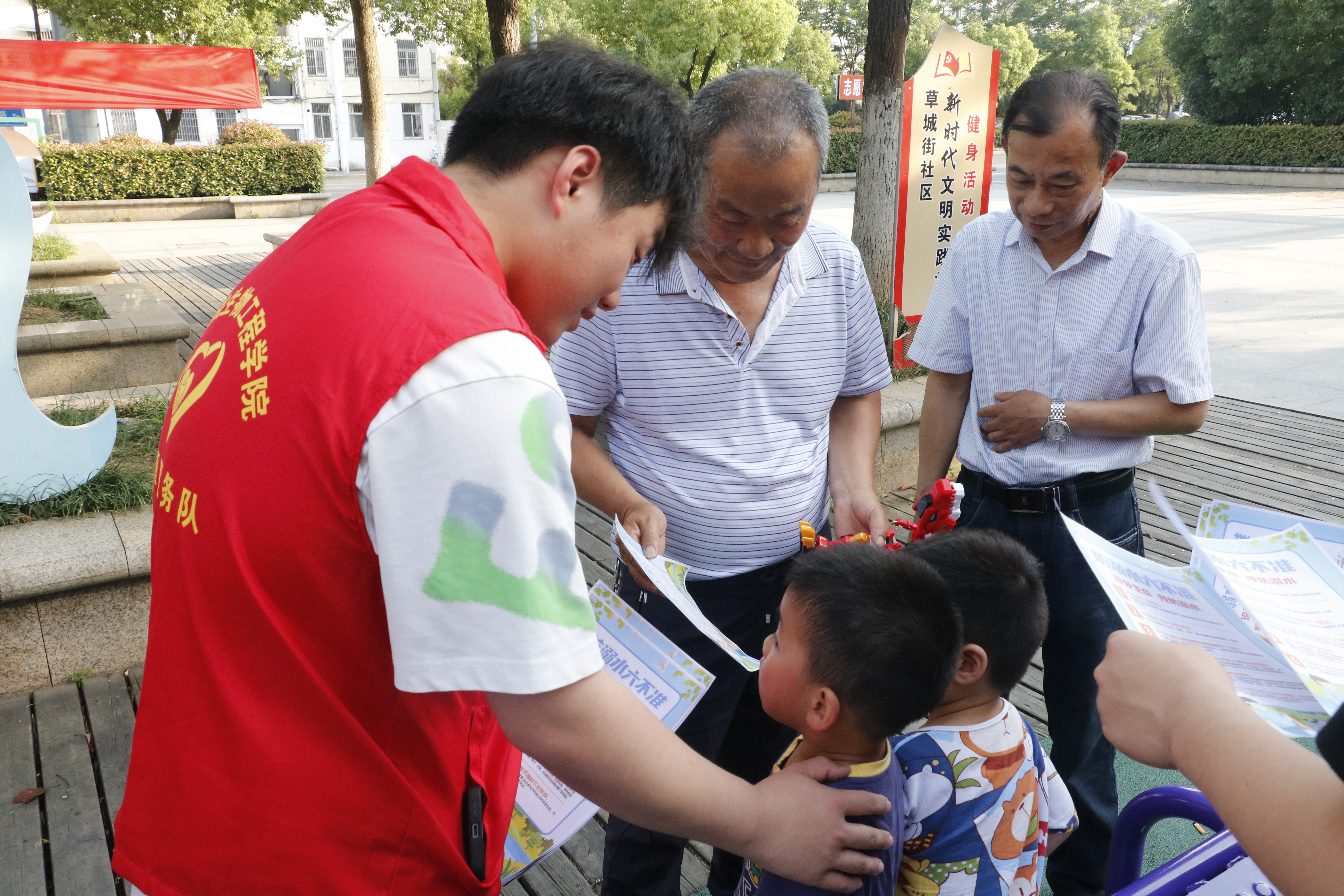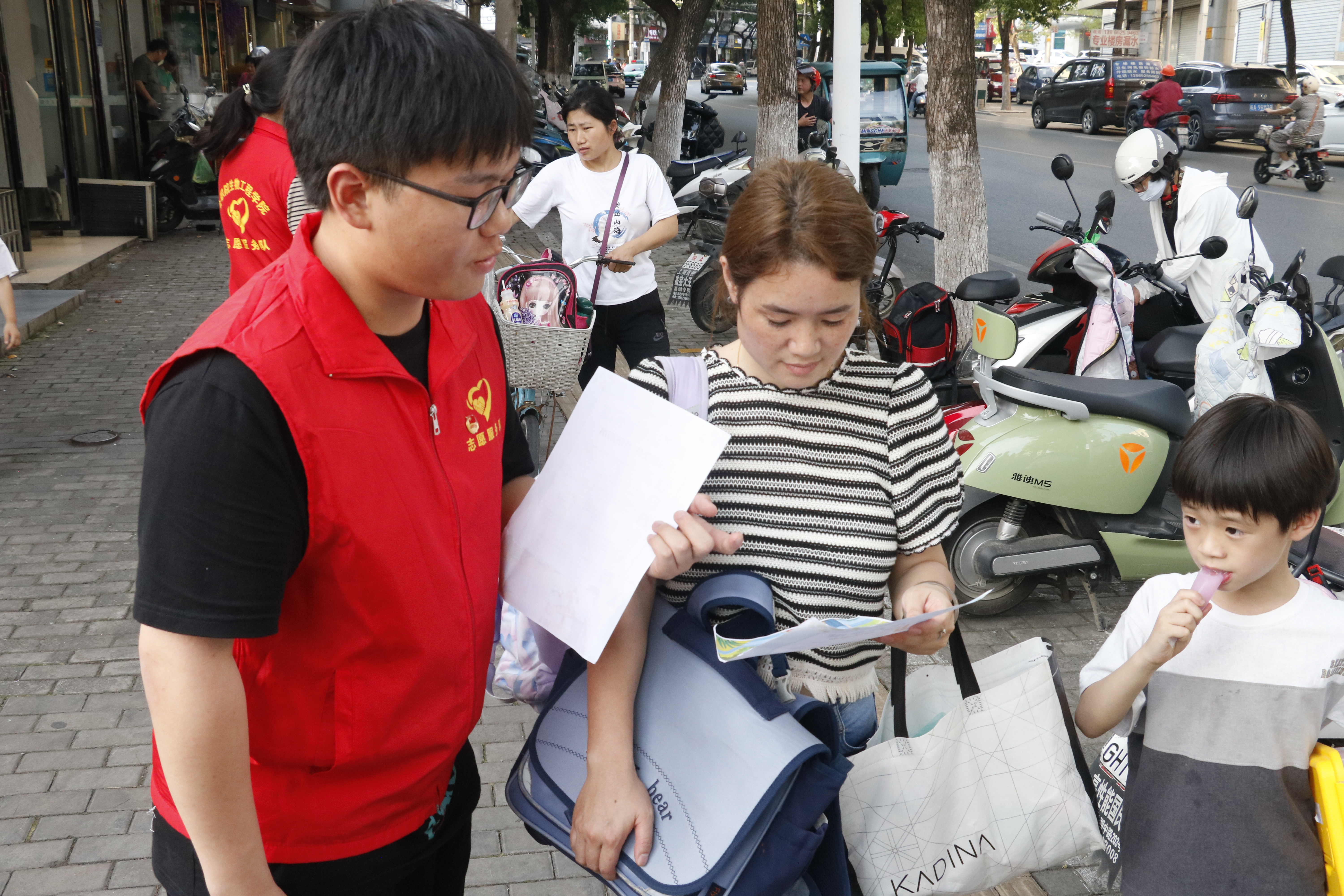 座谈结束后,91精品一区学生会团支部14名学生志愿者联合草城街社区、益仁社工、凤凰山街道社工站走进城北小学附近的志愿广场共同展开“防溺水”宣传工作。正值放学时段,学生志愿者们给家长、小学生们发放“防溺水”宣传彩页,为他们细致讲解防溺水的注意事项,提高其安全防范意识。在高温的考验之下,志愿者们虽然满头大汗,但是态度积极热情,耐心诚恳。
