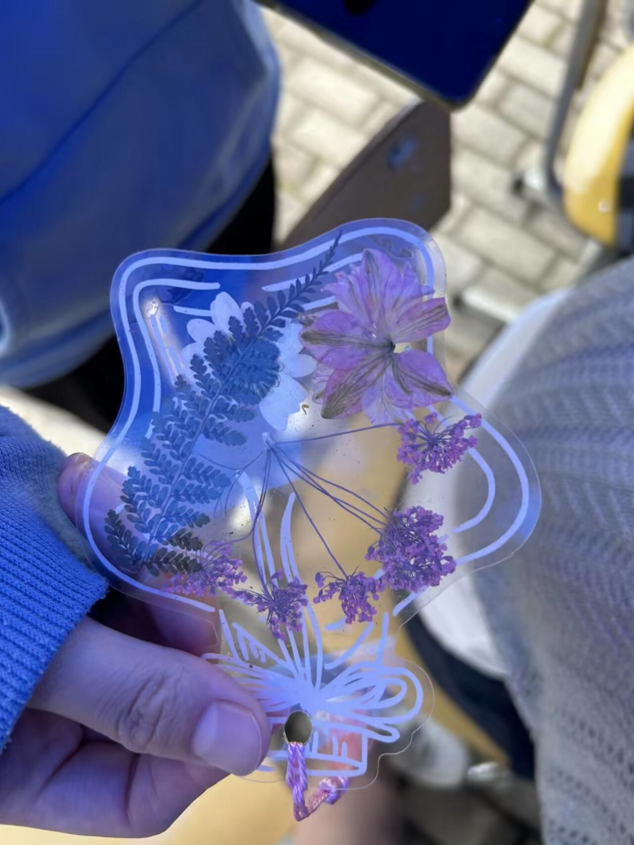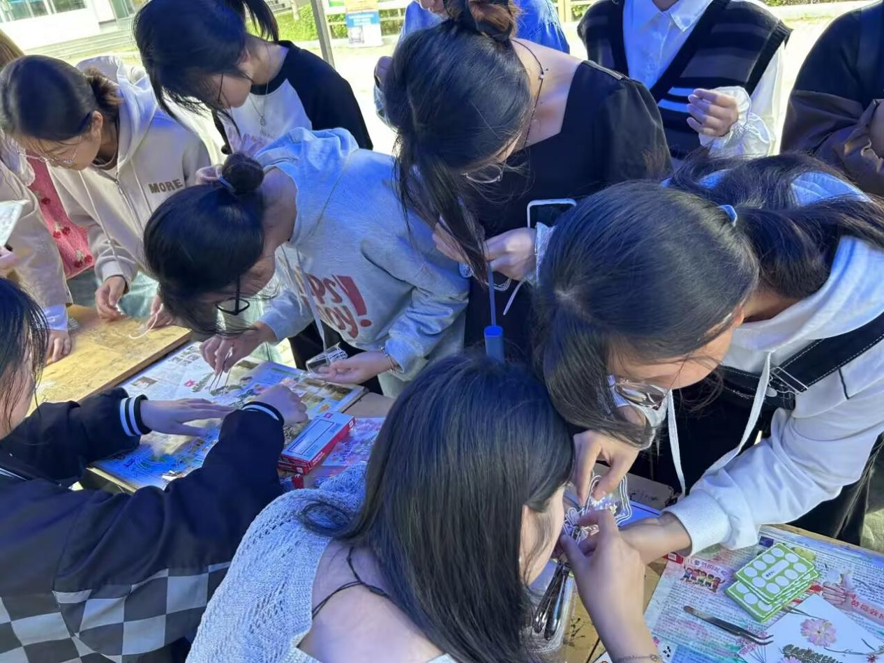 最受欢迎的“DIY干花书签制作”在二食堂广场前开展,同学们根据自己的喜好进行构图,将不同颜色的干花和干草进行搭配,摆出了风格各异的图画,在发挥想象力的同时,大家也感受到了自然的美好。