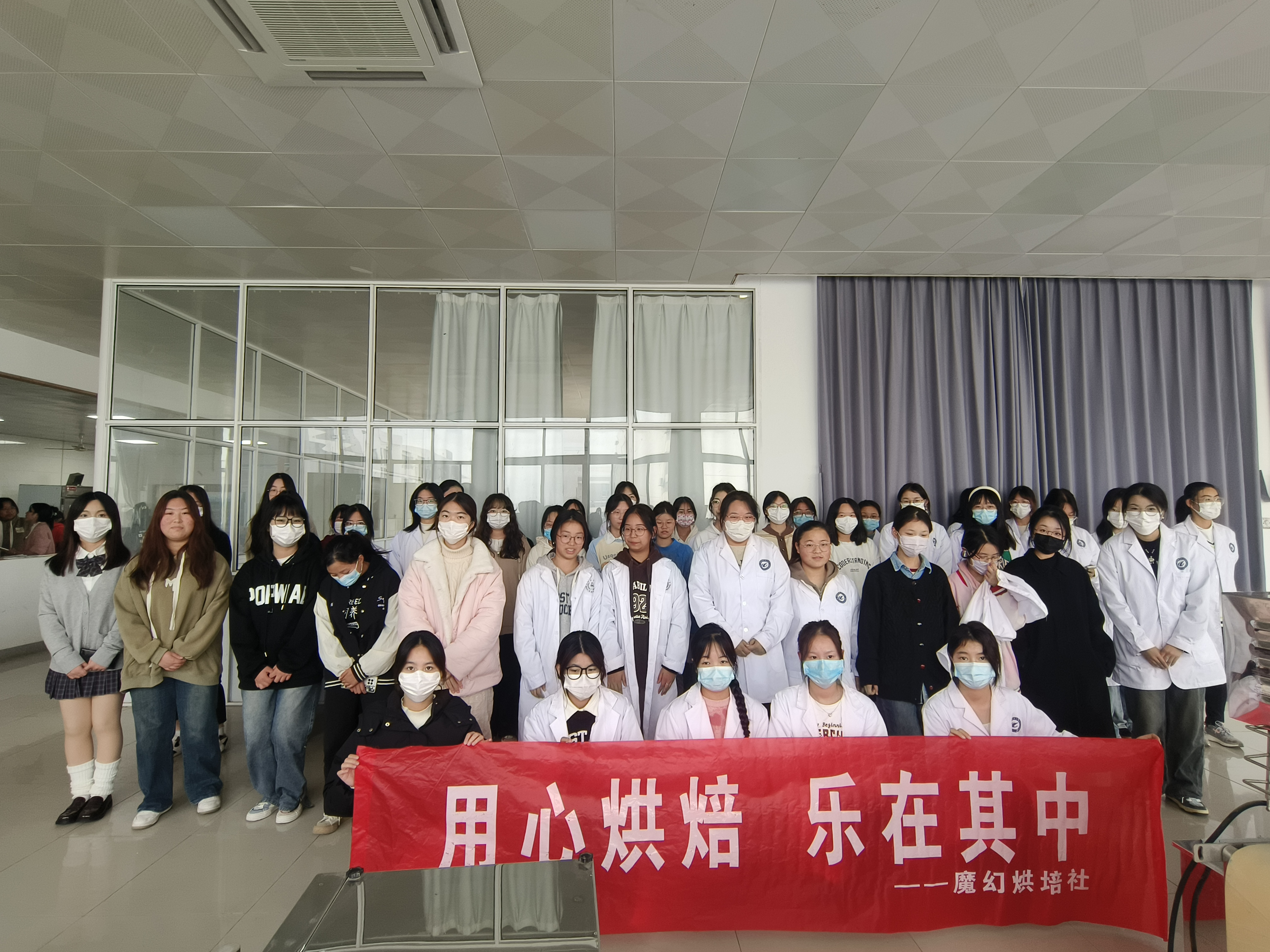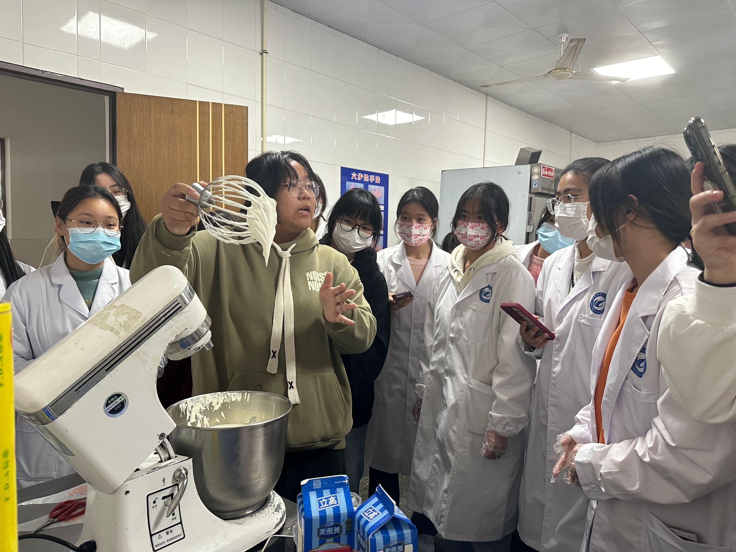 活动开始,魔幻烘焙社社长王子轩管理现场签到,维持秩序,同时择取志愿者为活动准备所需材料,并规定活动人员需身穿白大褂,佩戴口罩,保证烘焙蛋糕制作过程中的卫生。活动最开始由指导老师展示奶油的打发、涂抹以及裱花。活动中,团总支书记肖昕与学生们一同制作手工DIY蛋糕,她强调大学生在学习专业课知识的同时也要将其运用之实践,不断提升自我的综合素质。活动结束之际,学生们纷纷同肖昕老师分享自己的心得,在进行合照记录美好时光之后一同品尝劳动成果。最后,团总支书记肖昕还指出活动结束要及时清扫台面、带走垃圾,注意个人卫生等。