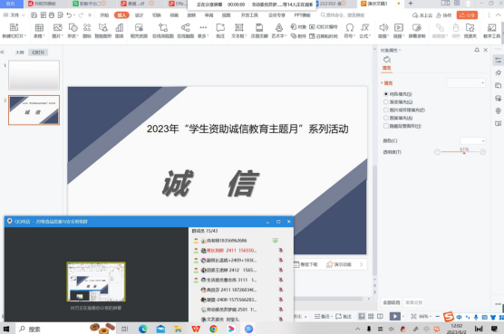 本次宣讲活动以班级为单位开展,内容丰富、形式多样。毕业班辅导员利用腾讯会议、钉钉直播、QQ视频电话等手段组织开展线上活动,为学生详细解读国家及学校出台的资助政策,使学生充分了解各项资助政策与申请流程,为学生开启求学绿色通道;面向毕业生进行生源地信用助学贷款毕业确认工作,并以学费催缴作为教育素材,督促学生及时履行还款义务,增强学生责任意识、法律意识,加强学生诚信观念教育。