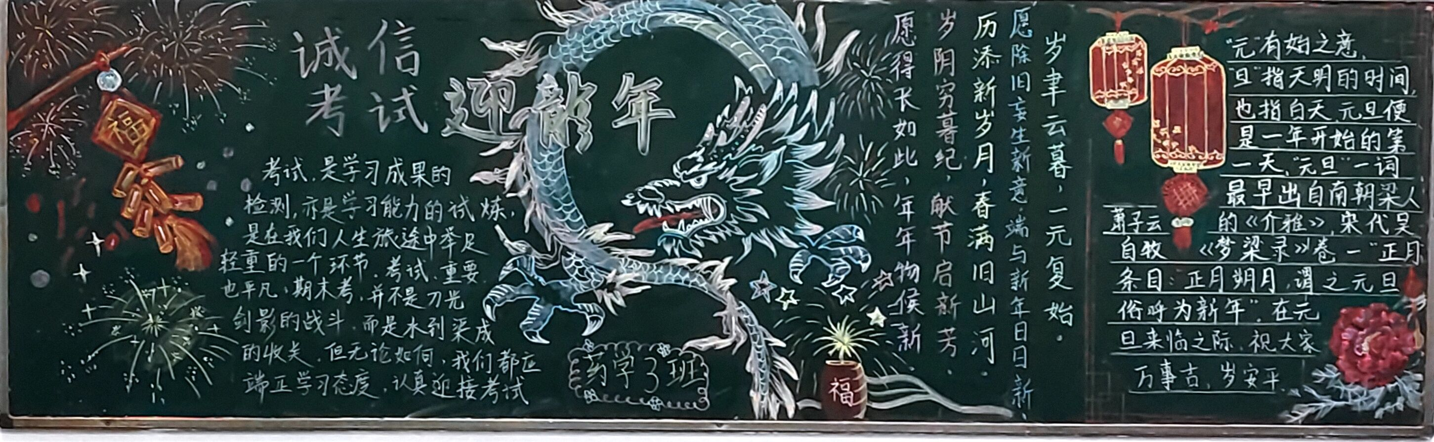 此次板报内容主要分为两部分,一个是喜迎新年,2024年即将来到,面对新的一年,同学们会有新的目标和新的愿望,可结合传统元素对黑板报进行创作。另一个主题是严肃考风考纪,学期即将结束之际,同学们将面临期末考试。不仅是对学习的总结,更是一个很好的对自己一学期所学知识的检测机会。其内容需要紧扣主题,积极向上。通过同学们辛苦积极的创作,板报内容丰富多彩。既展现了同学们对新年新气象的展望,也表现出对考试规则严格遵守的态度。板报中栩栩如生的龙,正如同学们一样龙图大展。在同学们画的鞭炮与烟花中,看到了璀璨夺目的大学生活。内容更能表达出同学们对期末考试的信心满满,正如同学们所说,诚信乃安身立命之本。