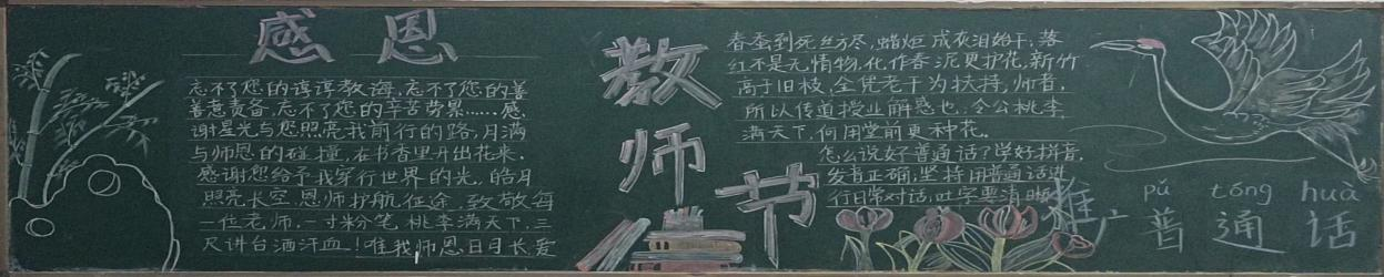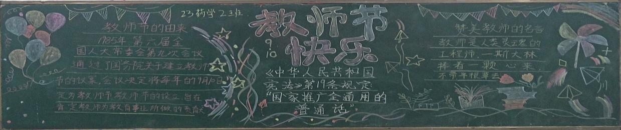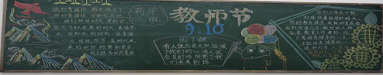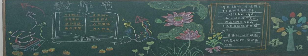 通过这次教师节黑板报的设计,我们希望能够表达对教师的敬意和感激之情,同时也激励学生努力学习,成为社会的有用之才。 普通话黑板报的设计理念应围绕推广普通话的重要性、意义以及实践应用进行展开——23药产三班
