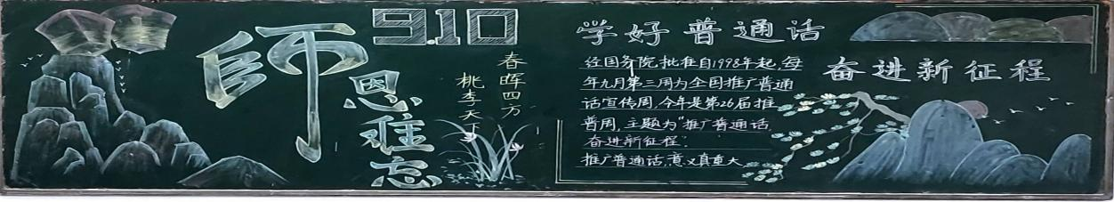 以九月十号的教师节为主题加上推广普通话,感受汉语之美。完成本次黑板报,山高水长有时尽,唯有师恩无穷期。用教师节由来等内容加深学生对此感受,用书本竹子来形容老师的形象。对于普通话,加强推广传承汉字语言之美的意识。——23食检一班